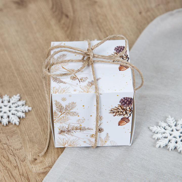 - Kleine würfelförmige Geschenkboxen mit Weihnachtsmotiv bzw. Herbstmotiv. Die Weihnachtsschachteln in weiß mit dezenten Verzierungen wie Zapfen und Zweigen in braun / gold sind eine tolle VERPACKUNG FÜR KLEINE WEIHNACHTSGESCHENKE und für Geschenke im Herbst.