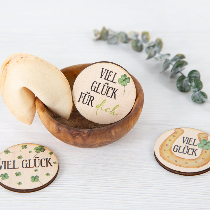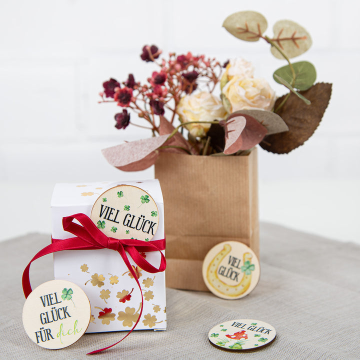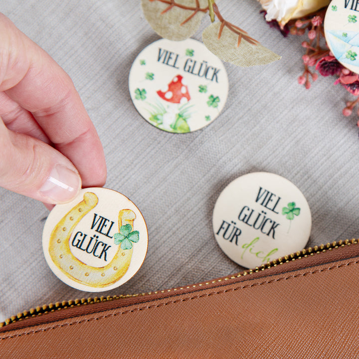 - Wunderschöne, liebevoll gestaltete Glücksbringer aus Holz mit verschiedenen Glückssymbolen und dem Schriftzug VIEL GLÜCK. Jedes Motiv ist zweimal im Set enthalten: Kleeblatt, Marienkäfer, Fliegenpilz, Glücksschwein
