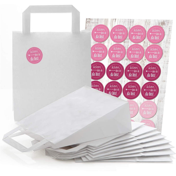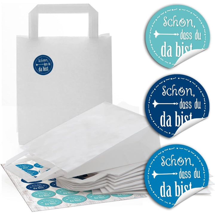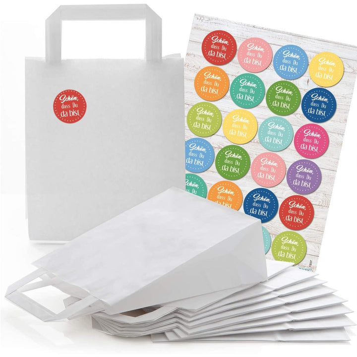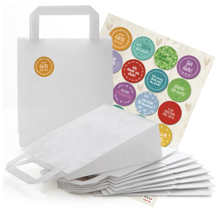 Weiße Papier-Tragetaschen 18 x 8 x 22 cm mit Henkel – Papiertüten mit Aufklebern für Feste & Give-aways