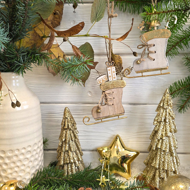 Der rustikale Materialmix aus Holz und Metall verleiht den Anhängern eine warme, natürliche Optik. Feine goldene Akzente und metallene Kufen sorgen für einen festlichen Glanz. Durch die Kombination von Naturfarben mit edlem Weiß und Gold passen die Anhänger zu klassischer, moderner oder skandinavischer Weihnachtsdeko.