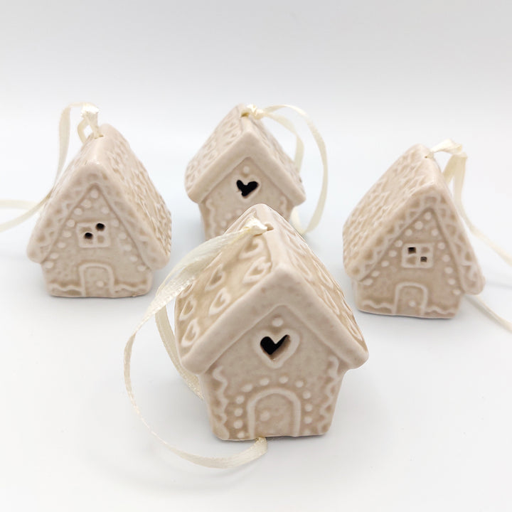 4er-Set Porzellan-Lebkuchenhaus creme-braun 4,5×3,5×5 cm – Weihnachtsanhänger