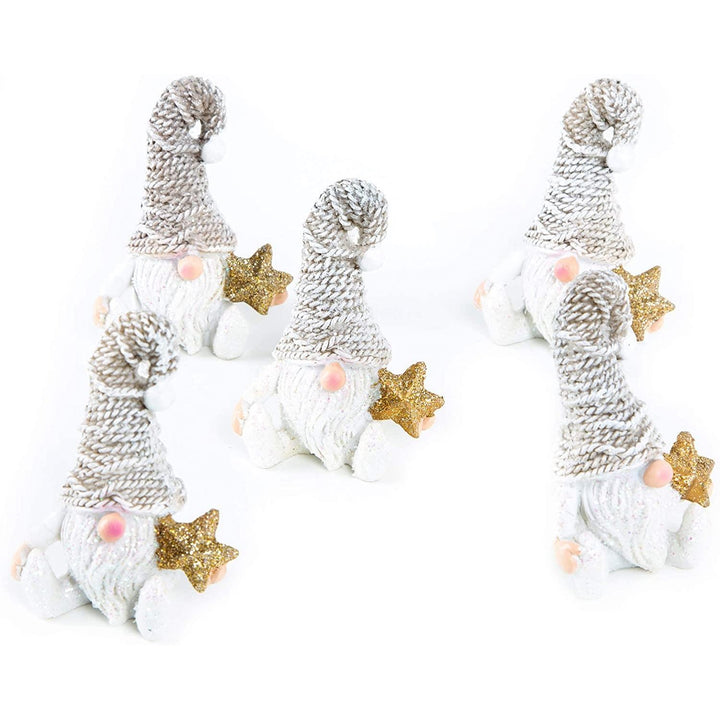 - 5 süße kleine glitzernde Weihnachtswichtel Figuren aus stabilem Polyresin in weiß mit braun-grauer Zipfelmütze und einem goldenen Stern. Größe: 7 cm.