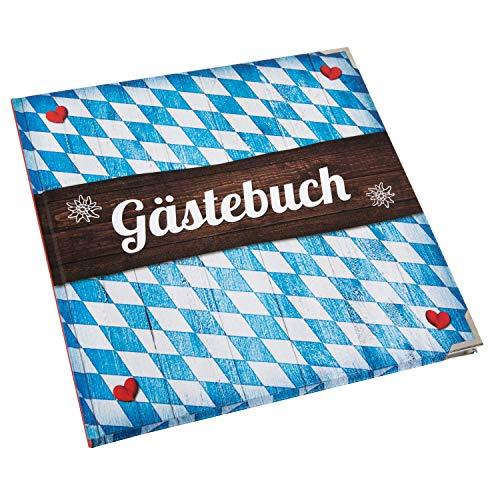 Hochwertiges leeres Gästebuch im bayerischen Stil mit weiß-blauem Rautenmuster, kleinen roten Herzen und dem Schriftzug GÄSTEBUCH auf Holzoptik Hintergrund. Das quadratische Buch hat die Maße 21 x 21 cm. 164 leere weiße Seiten mit 100 g/m² starkem Naturpapier. Hardcover, fadengeheftet, gebunden. Ideal als Buch zum Eintragen für Gäste bei der Hochzeit, Trachtenhochzeit, bei bayerischen Festen, Oktoberfest Party, Geburtstag, Bierfest, Bayernparty oder als rustikales Gästebuch für Hotel, Restaurant, Ferienhaus, Ferienwohnung, Pension, Gasthaus.