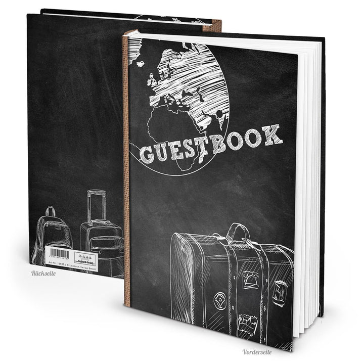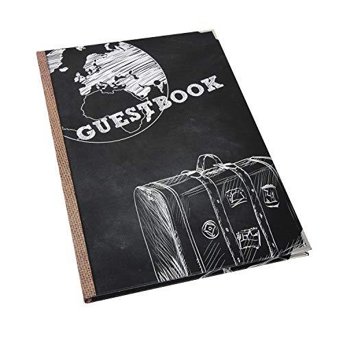 Schönes großes XXL Gästebuch mit englischem Titel GUESTBOOK mit leeren Seiten. Farbe: schwarz, weiß, braun. Motiv: Reisekoffer, Weltkugel. Größe: DIN A4. 164 leere weiße Seiten zur individuellen Gestaltung aus 100 g/m² starkem Naturpapier. Hardcover Buch, fadengeheftet, gebunden. Mit silberfarbenen Schutzecken aus Metall. Buch zum Eintragen für Gäste im Hotel, der Ferienwohnung, im Ferienhaus, im Restaurant oder Cafe, in einer Pension, am Campingplatz oder anderswo, wo nationale und internationale Feriengäste, Reisende und Urlauber begrüßt werden. Hier ist viel Platz für Bilder, Lob, Erinnerungen, Kritik und Anregungen.