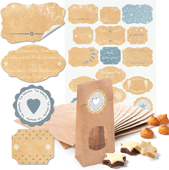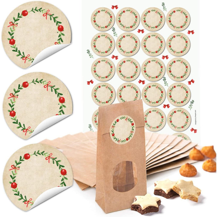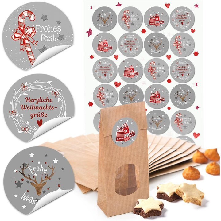 Mit dabei: festliche Weihnachtsaufkleber zur Dekoration und zum Verschließen der Tüten – perfekt für eine stimmungsvolle Verpackung in der Adventszeit oder an Weihnachten.