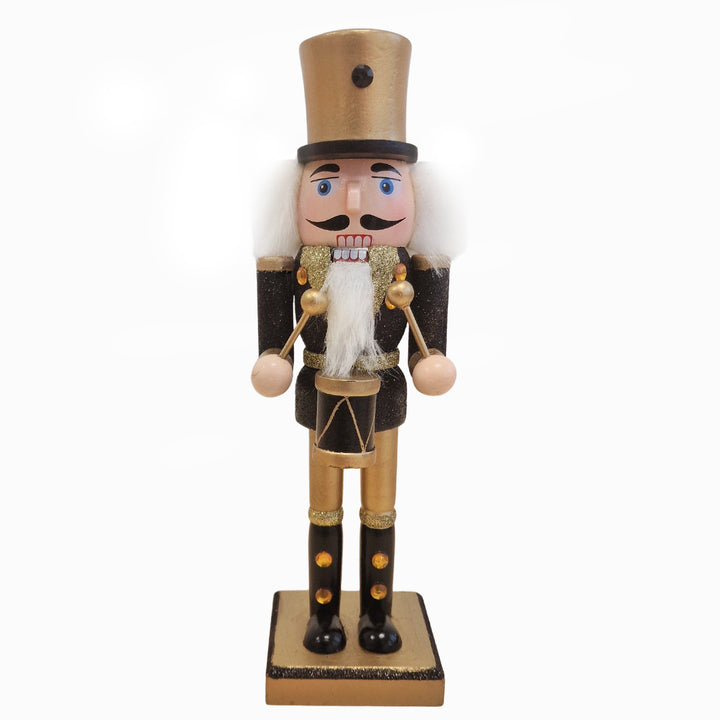 EDLER HOLZ-NUSSKNACKER: Trommler in Schwarz und Gold mit weißen Haaren, Bart und goldener Trommel – klassisch und festlich.