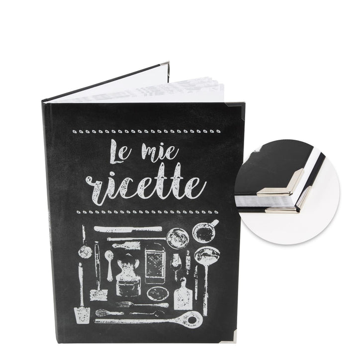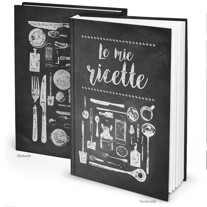 FARBE: Schwarz, weiß, Tafelkreide-Optik. Titel: Le mie ricette.