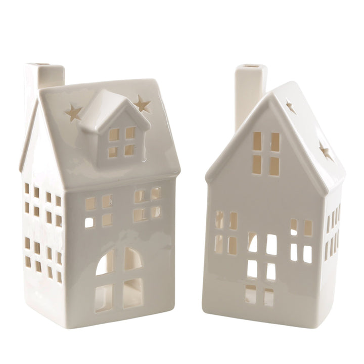 FESTLICHE TEELICHTHÄUSER: Zwei weiße Häuser aus Porzellan mit liebevollen Details und ausgeschnittenen Sternen – perfekt für eine stimmungsvolle Weihnachtsdeko.