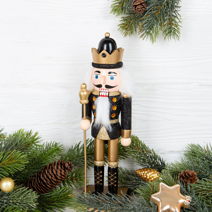 - Exklusive Nussknacker Figur aus Holz in der edlen Farbkombination schwarz, gold und weiß. Die Jacke des Königs glitzert weihnachtlich.