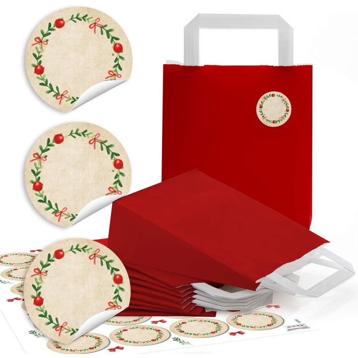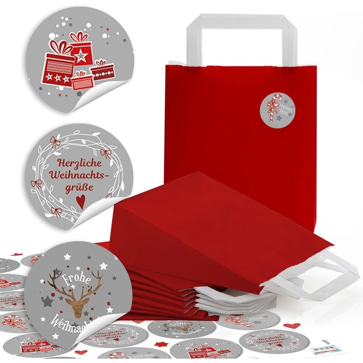 Rote Papiertüte mit Henkel 18 x 8 x 22 cm – Weihnachten Geschenktasche mit runden Aufklebern