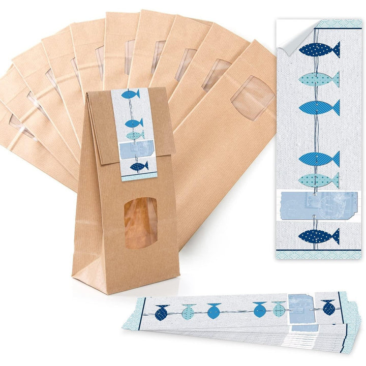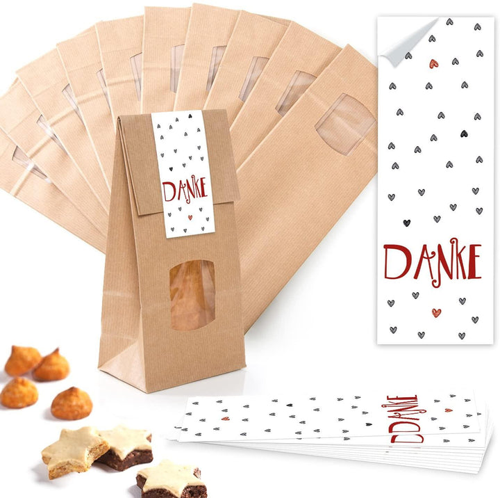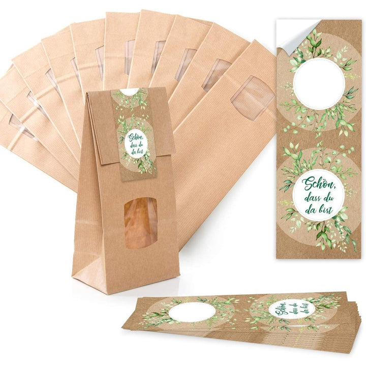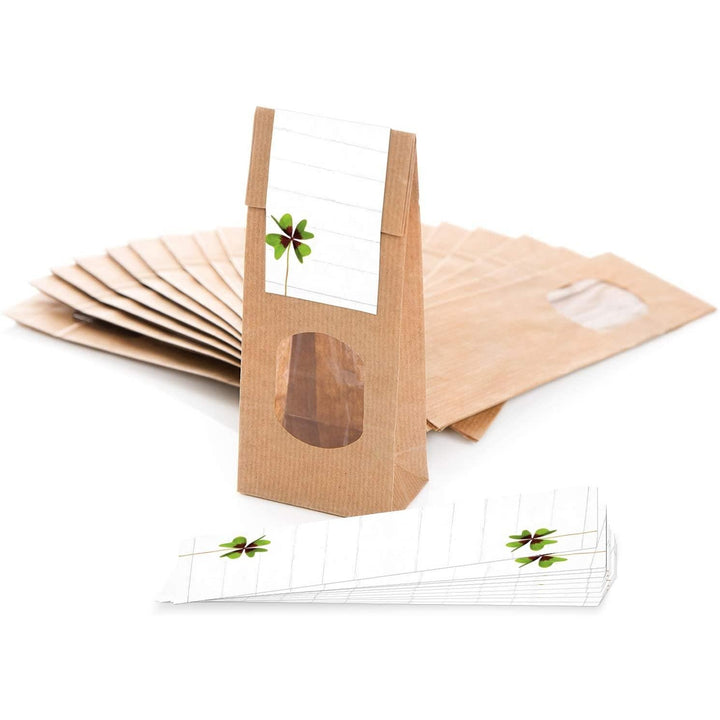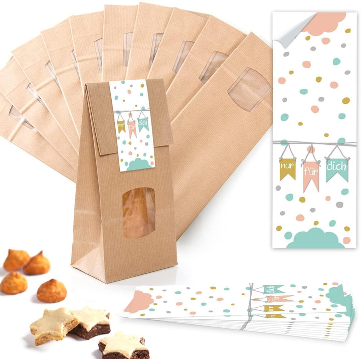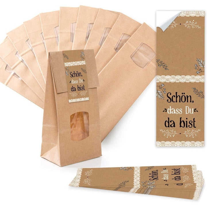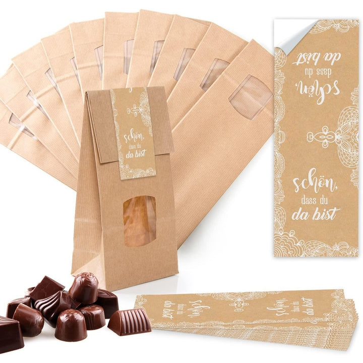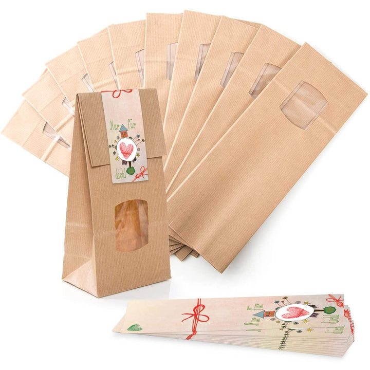 Braune Geschenk-Blockbodenbeutel mit Sichtfenster + Aufkleber – 10,5 x 29 cm – Verschiedene Motive