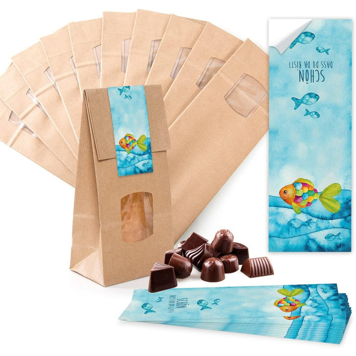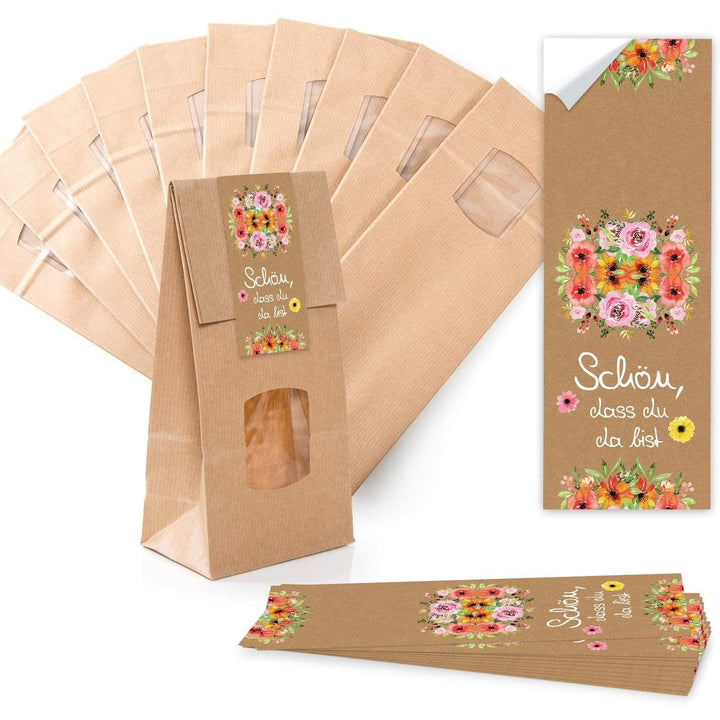 Mit dabei: dekorative, selbstklebende Aufkleber im Format 5 x 15 cm – in verschiedenen Designs zur Auswahl. Ideal zum stilvollen Verschließen, Personalisieren oder Verzieren der Tüten – passend für viele Anlässe wie Geburtstag, Weihnachten, Ostern oder Dankeschön-Geschenke.