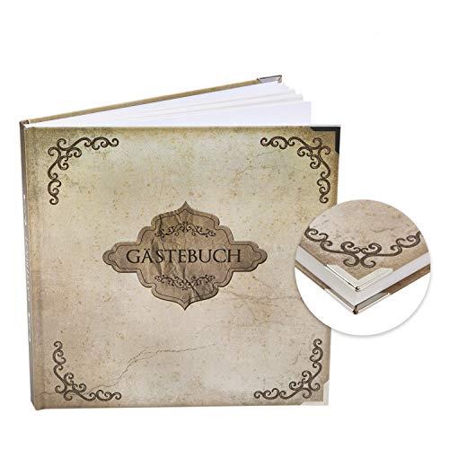 Schönes auf alt gemachtes Gästebuch im Vintage-Stil in den Farben braun und beige, rustikaler Stil. Größe: 21 x 21 cm. Hardcover, fadengeheftet, gebunden. 164 leere Seiten aus 120 g/m² starkem Recyclingpapier. Mit silberfarbenen Schutzecken aus Metall.Das Buch zum Eintragen für Gäste ist passend für viele Anlässe und Einrichtungen: Hochzeit, Taufe, Geburtstag, Kommunion, Firmenfeier oder zum Auslegen in einer Pension, Hotel, Gästehaus, Ferienhaus, Ferienwohnung, Urlaub auf dem Bauernhof, Behörde, Amt, Veranstaltung.assend zu den Gästebüchern haben wir auch kleine Gastgeschenke, Tischkarten, Give-Aways und andere Kleinigkeiten für eure Gäste.